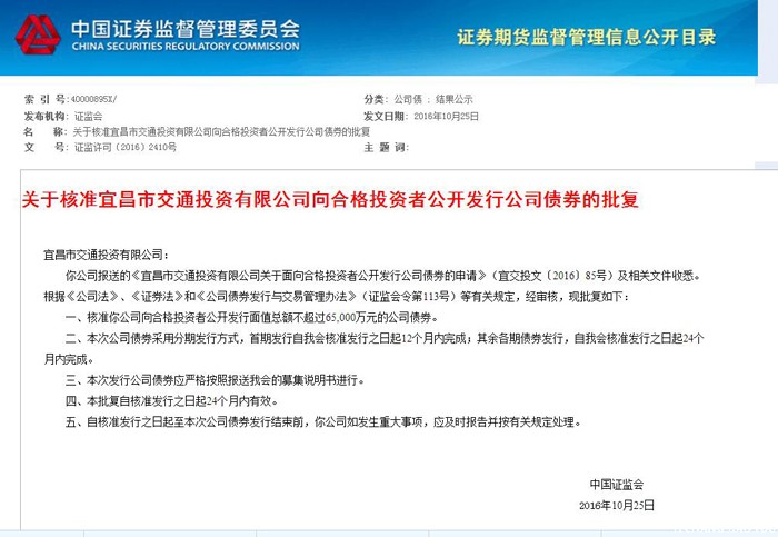 2016年10月25日,筆者從中國證券監(jiān)督管理委員會獲悉,根據(jù)中國證監(jiān)會證監(jiān)許可【2016】2410號《關于核準宜昌市交通投資有限公司向合格投資者公開發(fā)行公司債券的批復》文件,交投公...
